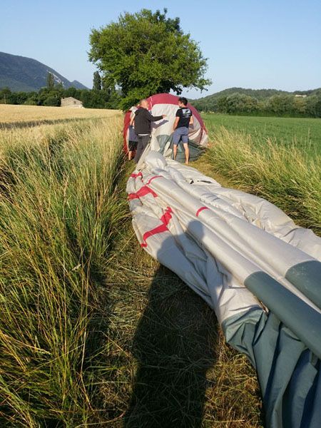 Sitôt arrivés sur un champ, des passagers descendent pour permettre de tirer la mongolfière jusqu'au chemin le plus proche.